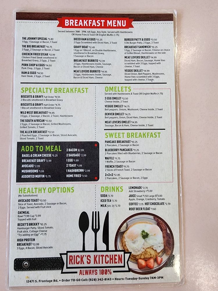 Welcome to Rick's Kitchen, a delightful American breakfast and brunch haven located at 12471 S Frontage Rd, Yuma, AZ. With an inviting, homey atmosphere and attentive service, this charming spot is perfect for all breakfast lovers.